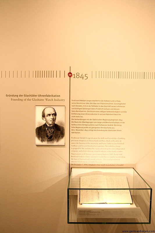 บุคคลที่มีส่วนอย่างมากในการเริ่มต้นอุตสาหกรรมนาฬิกาที่เมือง Glashütte นี้มีชื่อว่านาย Ferdinand Adolph Lange(รูปข้างบน) โดยการเปิดสอนวิชาการผลิตนาฬิกาซึ่งเน้นหนักไปทางนาฬิกาพกที่มีกลไกซับซ้อน(watchmaker) ให้กับช่างฝีมือในเมืองจำนวน 15 คนเมื่อปี 1945 เป็นเวลาสามปี(สอนแล้วทางรัฐบาลจะให้ยืมตังนะครับ) ซึ่งต่อมา สามคนในนี้ได้แก่ นาย Julius Assmann, นาย Moritz Großmann และนาย Adolf Schneider รวมถึงตัวนาย Lange เองแต่ละคนได้เปิดโรงงานผลิตนาฬิกาของตนเองขึ้นมา เรียกได้ว่าทั้งสี่คนนี้เป็นผู้ที่ทำให้เมืองนี้และรวมถึงทั้งเยอรมนี มีบทบาทสำคัญในแวดวงนาฬิกากลไกในเวลาต่อๆ มา