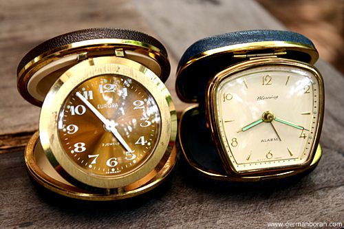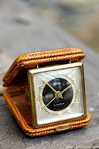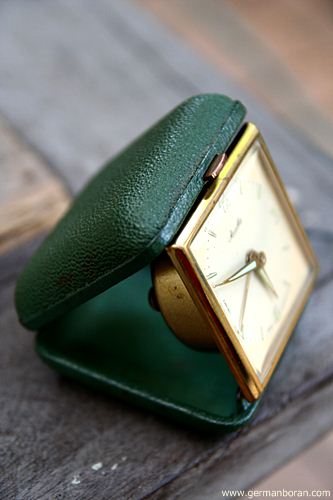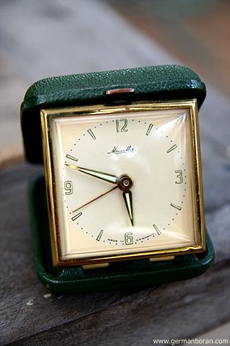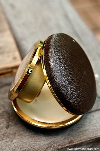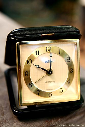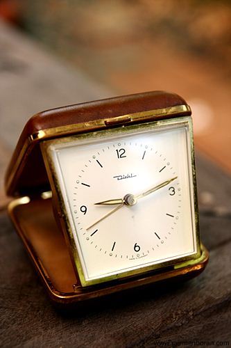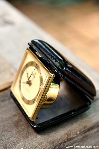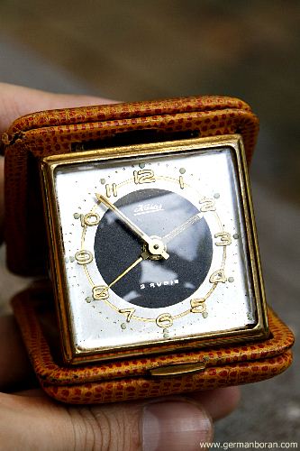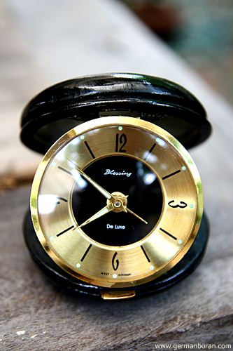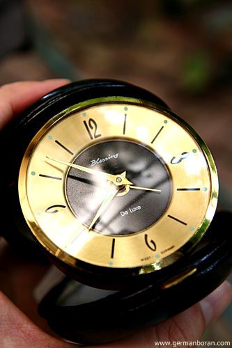 รหัส: B7_3 ข้อมูล: นาฬิกาปลุกตลับแป้ง(Travel Alarm Clock) เยอรมันโบราณ แบบไขลาน ยี่ห้อ Blessing รุ่น De Luxe ตลับหนังดำขลับกริ๊บๆ งามลึกล้ำ 8)