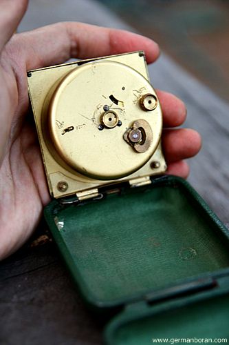 รหัส: B5_86_5 ข้อมูล: นาฬิกาปลุกตลับแป้ง(Travel Alarm Clock) เยอรมันโบราณ แบบไขลาน ยี่ห้อ Diehl