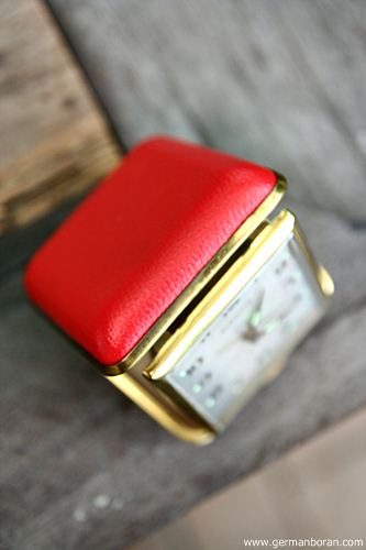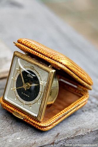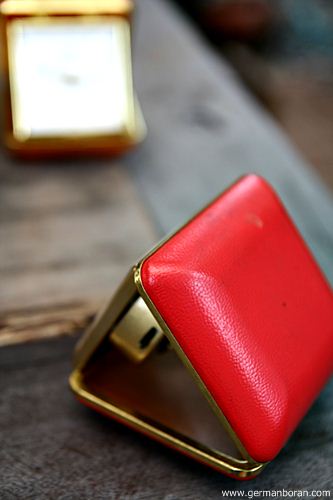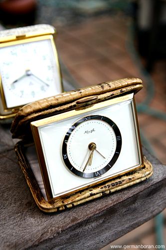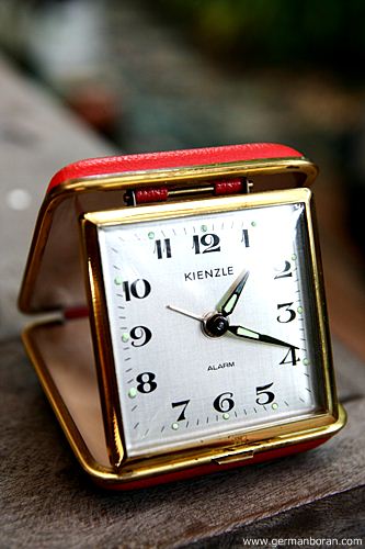 รหัส: B9_11 ข้อมูล: นาฬิกาปลุกตลับแป้ง(Travel Alarm Clock) เยอรมันโบราณ แบบไขลาน ยี่ห้อ Kienzle ตลับหนังลายสวยๆ จ้า  :-*