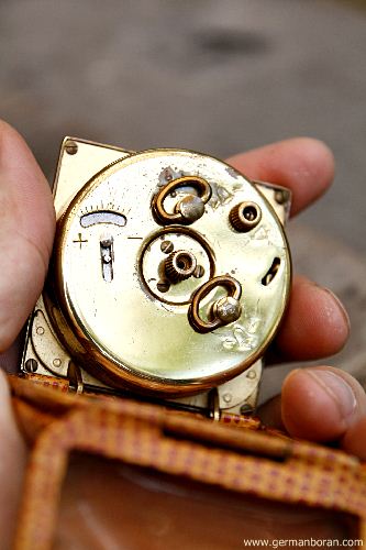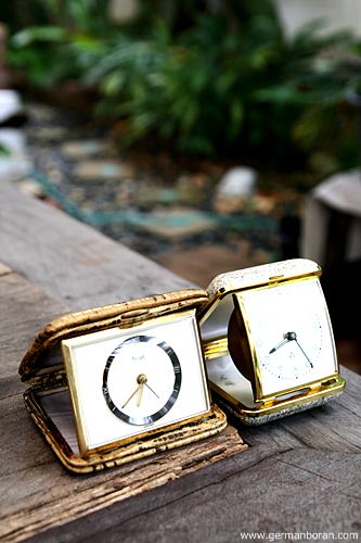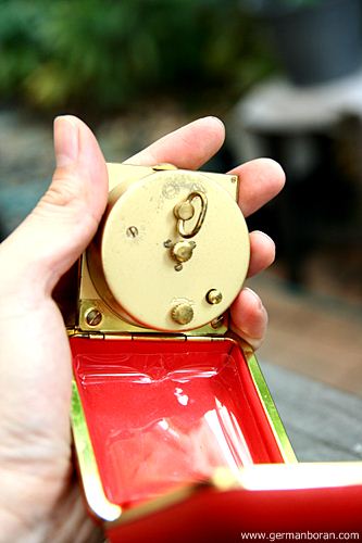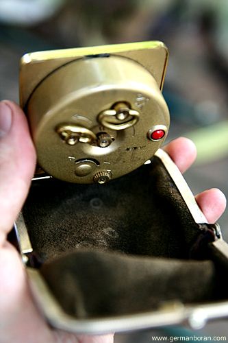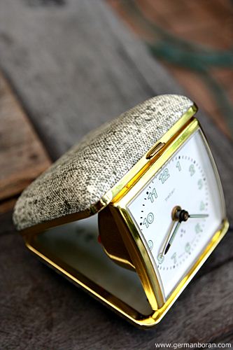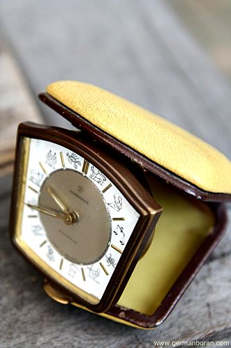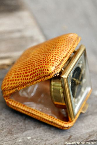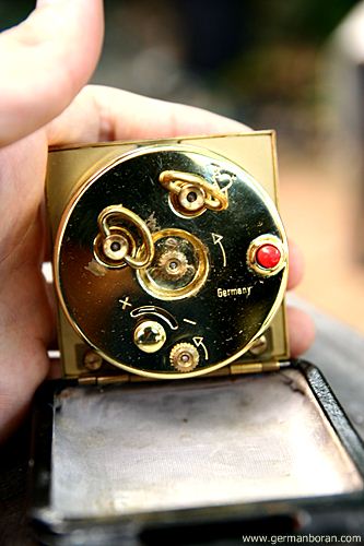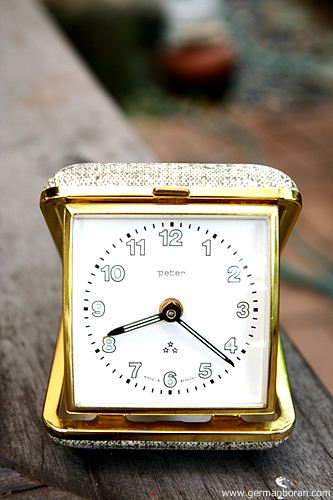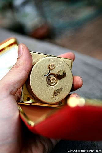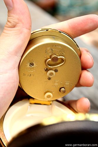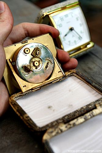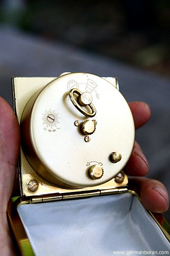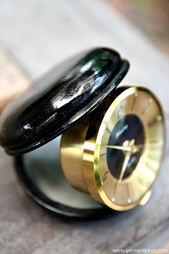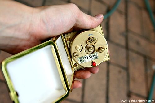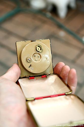 รหัส: B6_48 ข้อมูล: นาฬิกาปลุกตลับแป้ง(Travel Alarm Clock) เยอรมันโบราณ แบบไขลาน ยี่ห้อ Peter สามดาว ตลับลวดลายสวยๆ ครับ  ;D