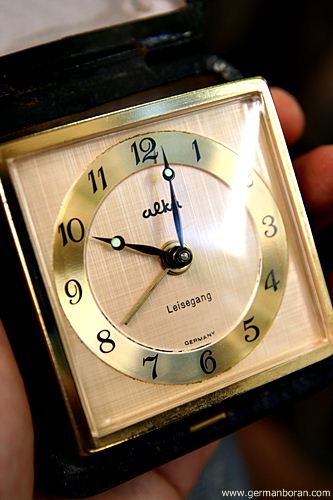 รหัส: B6_96_2 ข้อมูล: นาฬิกาปลุกตลับแป้ง(Travel Alarm Clock) เยอรมันโบราณ แบบไขลาน ยี่ห้อ Alku รุ่นเดินเงียบ(Leise=quiet)แบบนี้นานๆ จะเจอทีกับนาฬิกาปลุกตลับแป้ง สภาพกริ๊บๆ ครับ  8)