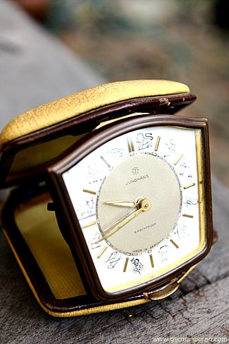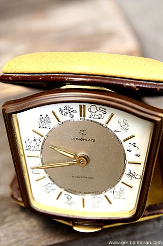 รหัส: B8_80 ข้อมูล: นาฬิกาปลุกตลับแป้ง(Travel Alarm Clock) เยอรมันโบราณ แบบไขลาน ยี่ห้อ Junghans ตลับหนังสวยๆ หน้าปัดลวดลาย 12 ราศี งามจริงงามจังค้าบบบ  ;D