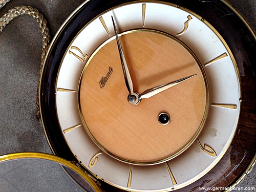 รหัส: D5_0_5 ข้อมูล: นาฬิกาแขวนหัวเรือเยอรมันโบราณ ยี่ห้อ Hermle แบบใบ้ลานเดียว ขนาด กxส(22x22cm.) ตัวเรือนไม้สภาพกริ๊บๆ จ๋วยๆ จ้ะ  :-*
