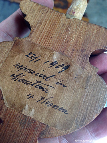 รหัส: D5_88 ข้อมูล: นาฬิกาแขวนไหมซอเยอรมันโบราณ สามถ่วง ยี่ห้อ Gustav Becker(GB) ขนาด(กxสxล) 46x128x20cm. หน้าปัดกระเบื้องขนาด 7 นิ้ว 2 เลขโรมัน หน้าเขียนชื่อเจ้าของเดิม ณ เมือง Graz ประเทศออสเตรีย(https://en.wikipedia.org/wiki/Graz) ระบบตีทวนตีแส้ขดสองแส้สองค้อนทุกสิบห้านาที(เรียกว่า "Blind-mans" หรือ "Granne Sonnerie" Strike) ตู้นอกแกะลายสวยๆ สไตล์ AltDeutsch มีฉลากกระดาษออริจินัลแปะปี 1909 ที่ขุนล่าง คลาสสิคๆ สภาพสมบูรณ์หายากคร้าบบบ ^_^
