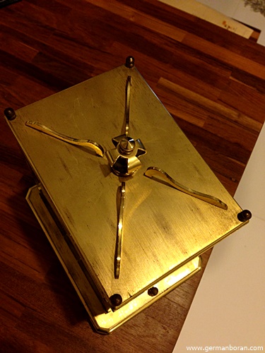 รหัส: D6_63 ข้อมูล: นาฬิกาตั้งโต๊ะเยอรมันโบราณ 400 วัน(Anniversary Clock) ยี่ห้อ Kern ตัวเรือนทองเหลือง สูงประมาณ 23cm. ทรวดทรงหกเหลี่ยมหลุยส์ๆ จัดว่าหายาก เป็นนาฬิกา 400 วันอีกเรือนที่น่าสะสมมากๆ ครับ  ;D