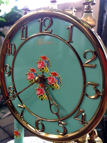 รหัส: D6_41 ข้อมูล: นาฬิกาตั้งโต๊ะเยอรมันโบราณ 400 วัน(Anniversary Clock) ยี่ห้อ Hermle ไซส์ใหญ่ สูงประมาณ 30cm. ขนาดตัวเรือน 20x20cm. สีเขียวมินท์ หน้าปัดเลขนูนเข็มงามๆ เพนส์ลายดอกไม้ทั้งเรือน สภาพสวยๆ วินเทจสุดๆ จ้าาาา  :-*