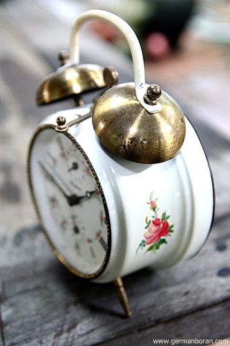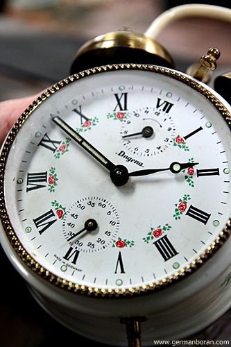 รหัส: D3_0_5 ข้อมูล: นาฬิกาปลุกไขลานเยอรมันโบราณ ยี่ห้อ Wehrle ตีสองกระดิ่งบน ขนาด 11x11cm. หน้าปัดงามหลายๆ ตัวเรือนขาวนวลเพ้นส์ดอกไม้สวยๆ น่ารักๆ ค้าบ  :-*