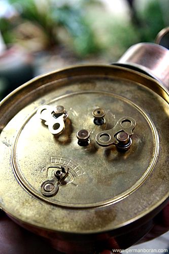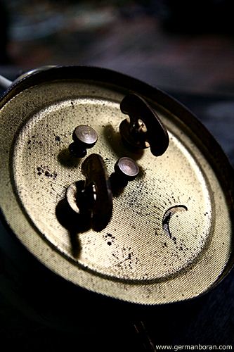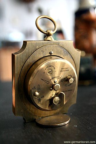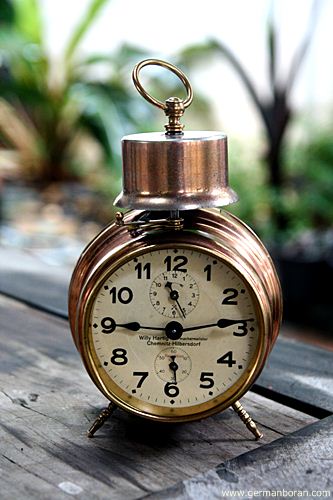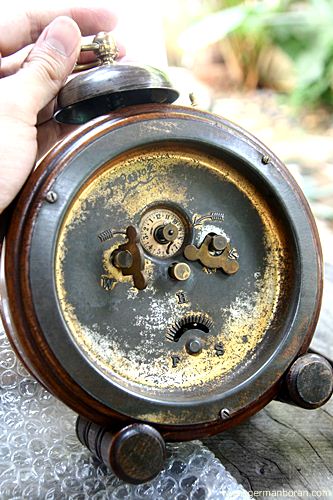 รหัส: D3_32 ข้อมูล: นาฬิกาปลุกไขลานเยอรมันโบราณ(German Alarm Clock) ยี่ห้อ EMES ขนาดหน้าปัด 7x14cm. ตัวเรือน Bronze + ทองเหลือง หรูหราอลังจ้าาา