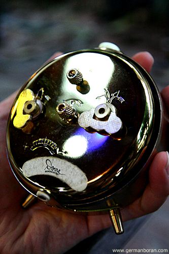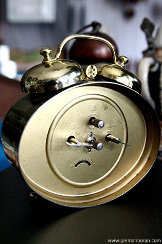 รหัส: D3_14_3 ข้อมูล: นาฬิกาปลุกไขลานเยอรมันโบราณ ยี่ห้อ Meister-Anker ขนาด 12x8cm. ตัวเรือนสีทองทรงไข่ ตีกระดิ่งบนจ๋วยๆ ครับ  :D