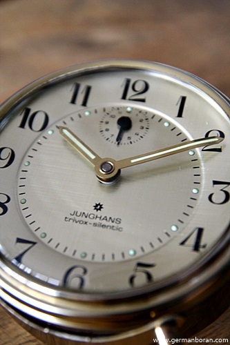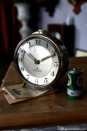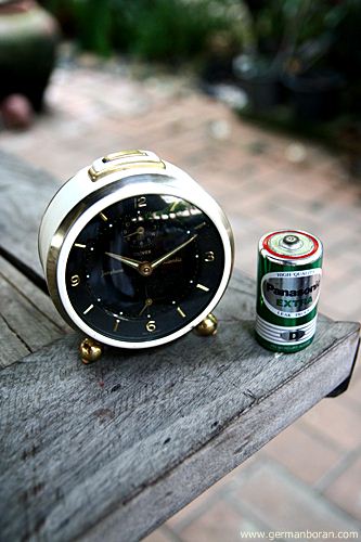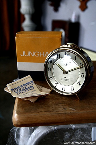 รหัส: D4_0_20 ข้อมูล: นาฬิกาปลุกไขลานเยอรมันโบราณ ยี่ห้อ Junghans รุ่น Trivox silent-tic(เดินเงียบ) หน้าปัดสีทองอร่าม สภาพงามๆ พร้อมกล่องและใบรับประกัน ใครรักใครชอบจุงฮันรุ่นยอดนิยมนี้ต้องรับไว้สะสมให้ครบชุดครับ น่าเก็บมากกๆ จ้ะ  8)