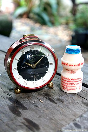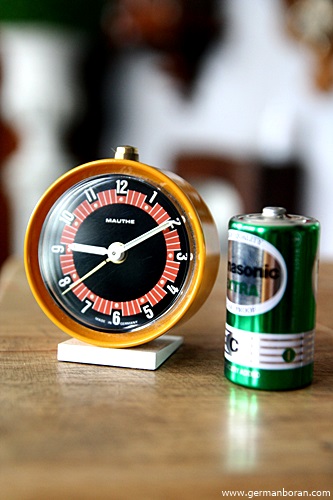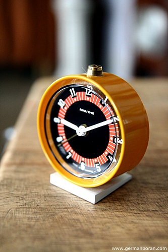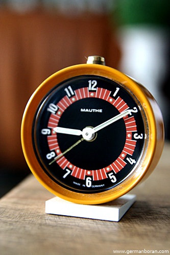 รหัส: D4_0_22 ข้อมูล: นาฬิกาปลุกไขลานเยอรมันโบราณ ยี่ห้อ Mauthe ไซส์จิ๋วหลิว ขนาด 6x6cm. สีสันเรโทรจัดๆ ยุค 60's-70's สภาพกริ๊บๆ สวยๆ หายาก น่ารักสุดยอดดดดดจ้าาา  8)