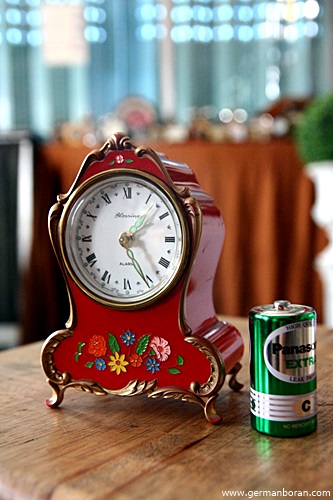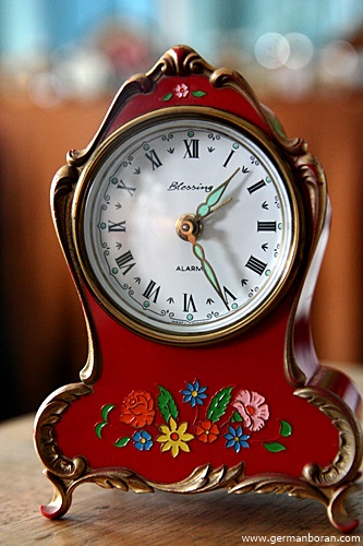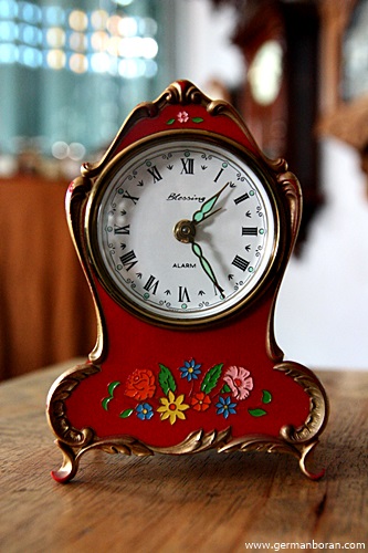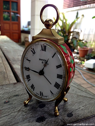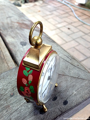 รหัส: D4_35 ข้อมูล: นาฬิกาปลุกไขลานเยอรมันโบราณ ยี่ห้อ Blessing ขนาด 8x11cm. ปลุกเสียงกล่องดนตรีสวิส ตัวเรือนเพ้นส์ลายดอกไม้งามๆ หน้าปัดจ๋วยๆ อายุ 4x-5x ปี น่าสะสมค้าบบบ  :-*