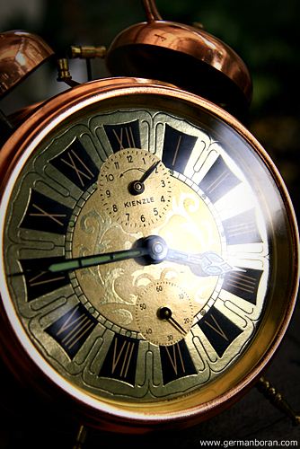 รหัส: B3_29 ข้อมูล: นาฬิกาปลุกไขลานเยอรมันโบราณ ยี่ห้อ Kienzle หน้าปัดขนาด 10x10cm. สามเข็ม ตัวเรือนทองแดง หน้าทองหลุยส์  ;D