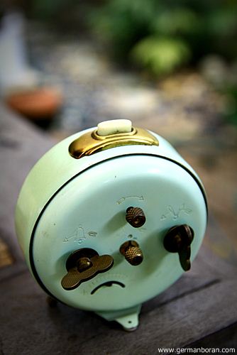 รหัส: B3_56 ข้อมูล: นาฬิกาปลุกไขลานเยอรมันโบราณ หน้าปัด 10x10cm. ผลิตช่วงต้นศตวรรษ 1900 เดินได้ ปลุกได้ เรือนนี้ไม่มียี่ห้อนะครับ คิดว่าน่าจะเป็นเฮาส์แบรนด์เล็กๆ หรือช่างในโรงงานทำมาใช้เอง แต่สวยคลาสสิคจริงๆ ครับ  ;D