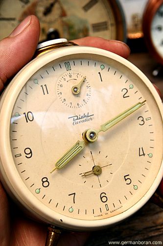 รหัส: C3_42_2 ข้อมูล: นาฬิกาปลุกไขลานเยอรมันโบราณ ยี่ห้อ Diehl รุ่นปลุกเสต็ป Cavalier ขนาด 8x8cm. สามเข็ม มีเข็มวินาที คลาสสิคๆ สวยๆ จ้า ;D