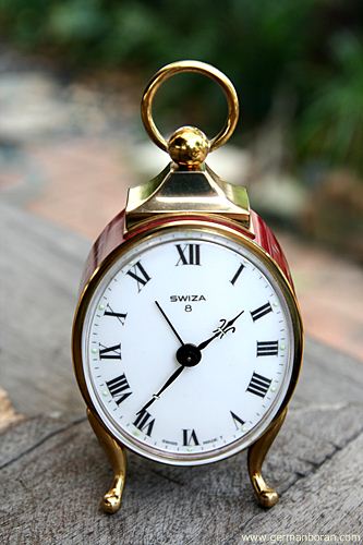 รหัส: C4_7 ข้อมูล: นาฬิกาปลุกไขลานโบราณ SWISS MADE ยี่ห้อ SWIZA หน้าปัดขนาด 6x7cm. ลายเพ้นส์มือสวยๆ เดิน 8 วัน หน้าปัดกระเบื้อง สภาพกริ๊บๆ หายากกกกจ้าาาา  :-*