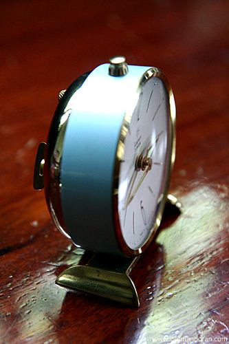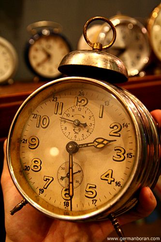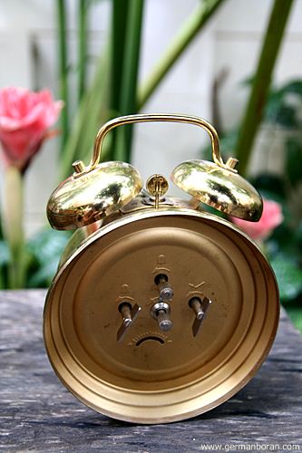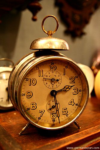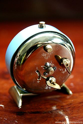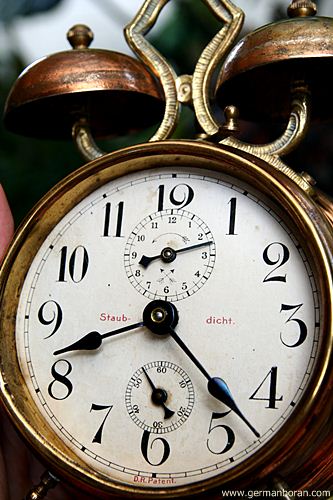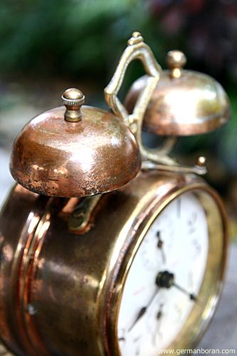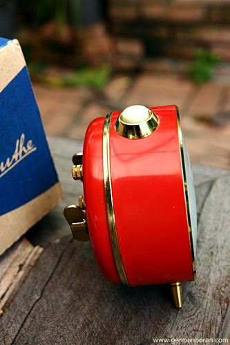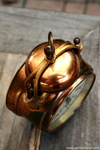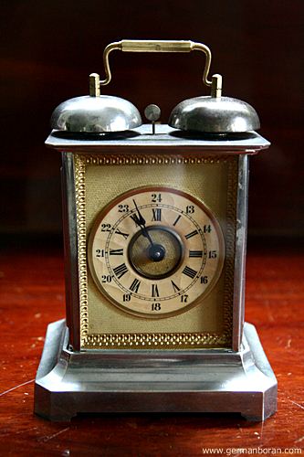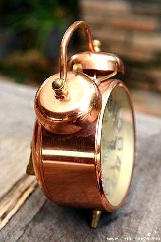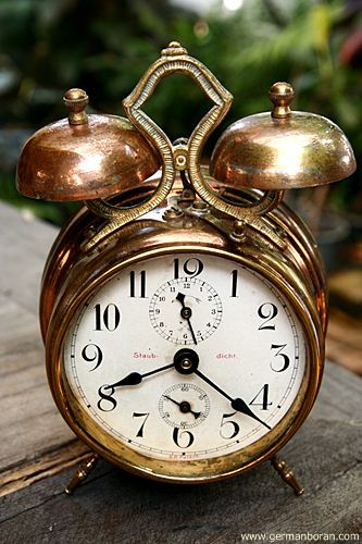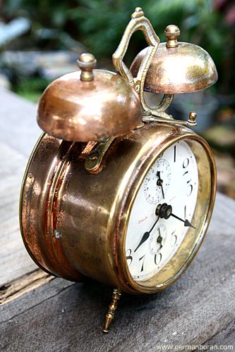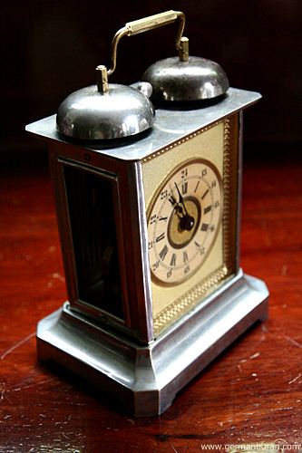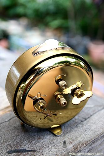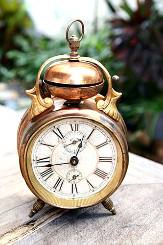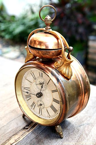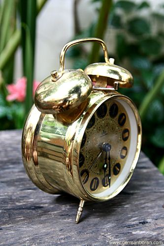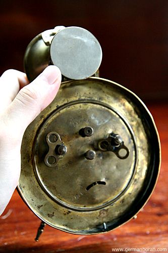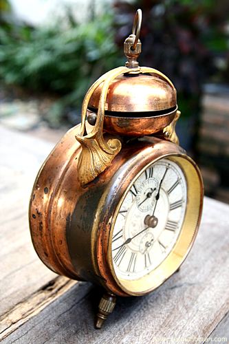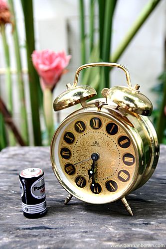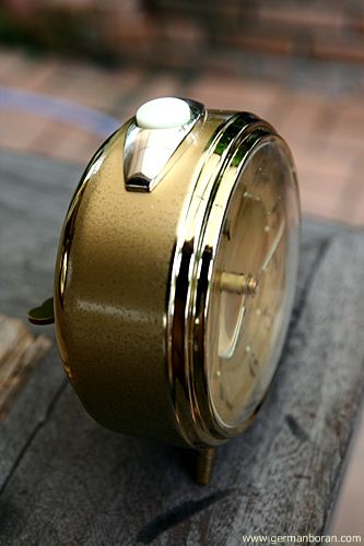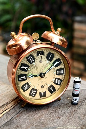 รหัส: C5_44 ข้อมูล: นาฬิกาปลุกไขลานเยอรมันโบราณ ยี่ห้อ Peter สามดาว ขนาด 8x8cm. หน้าลวดลายสีทองเงาๆ ตีกระดิ่งคู่สวยๆ จ้ะ  ;D
