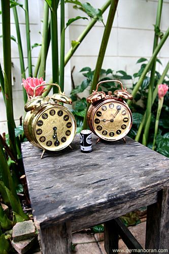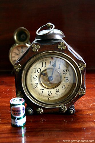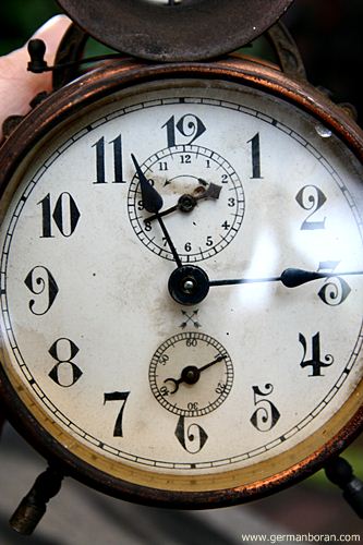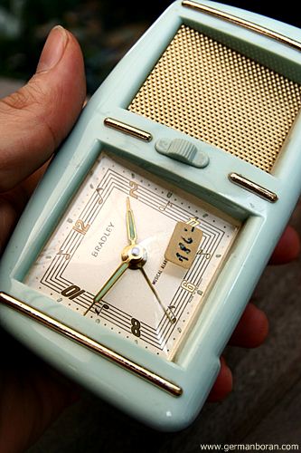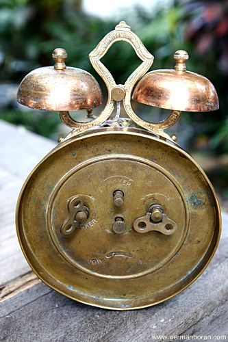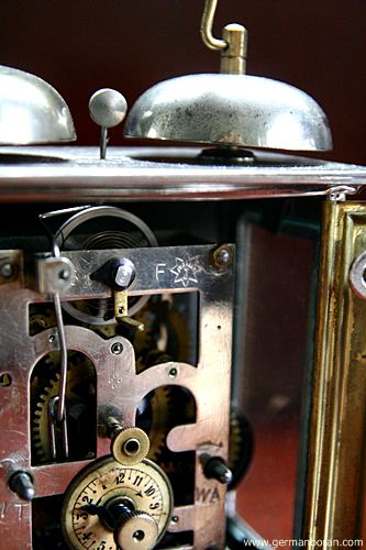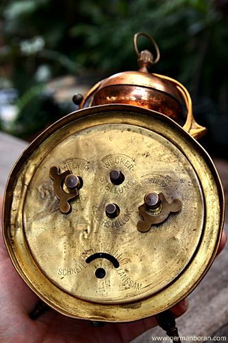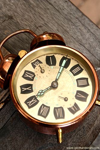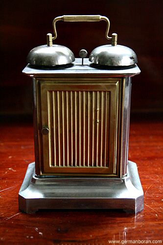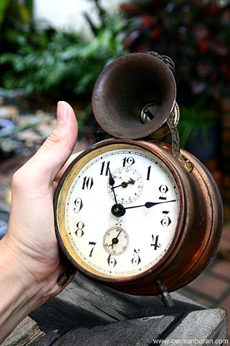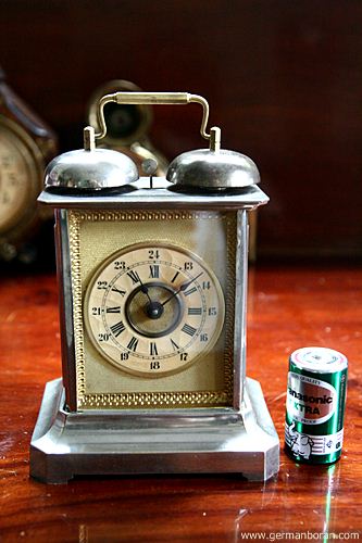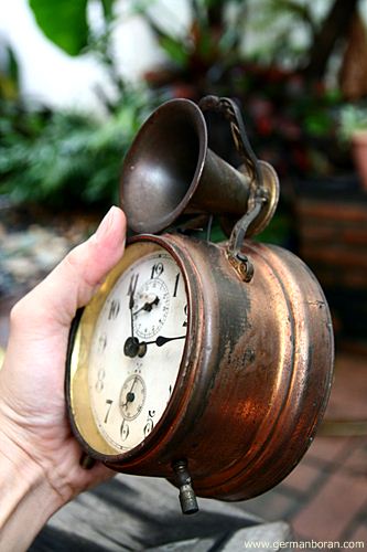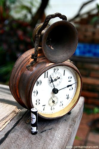 รหัส: B8_100 ข้อมูล: นาฬิกาปลุกไขลานเยอรมันโบราณ(German Antique Alarm Clock) ปี 1910 อายุ 100 ปี ยี่ห้อ Junghans รุ่น Cherie หน้าปัดขนาด 10x10cm. ตีสองค้อนสองกระดิ่งบน-ล่าง ค้อนซ้ายจะตีกระดิ่งล่างค้อนขวาจะตีกระดิ่งบนด้วยความถี่ไม่เท่ากันให้เสียงปลุกที่แตกต่าง หน้าปัดสวยสุดๆ เรือนนี้พิเศษหายากส์มากๆ ครับ  ;D