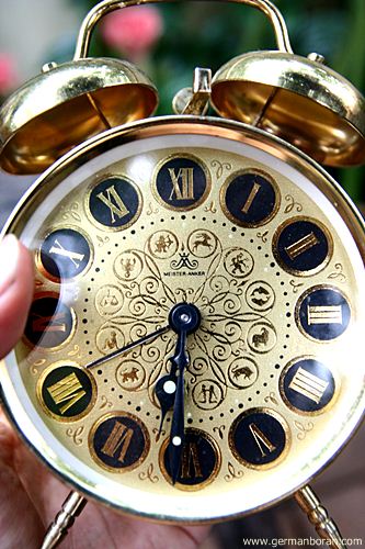 รหัส: C5_40 ข้อมูล: นาฬิกาปลุกไขลานเยอรมันโบราณ(German Alarm Clock) แบบไขลาน ยี่ห้อ Meister-Anker ขนาด 10x10cm. หน้าปัดสีทองเล่นลายไร้รื้วรอย ลวดลาย 12 จักรราศี ตีกระดิ่งบนสองข้าง สวยๆ ครับ  ;D