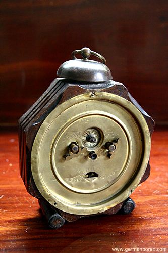 รหัส: C7_4 ข้อมูล: นาฬิกาปลุกไขลานเยอรมันโบราณ ยี่ห้อ Mauthe ยุคต้นศตวรรษ 1900 ไซส์ใหญ่หายาก ขนาด กxสxล: 17x22x6cm. ตัวเรือนไม้โบราณทรงแปดเหลี่ยมหนาหนักประดับทองเหลืองสวยๆ หน้าปัดฟิล์มเลขตลก เรือนนี้ง๊ามงามน่าสะสมจ้า  ;D
