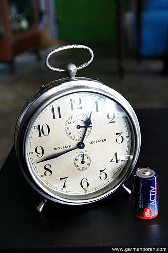 รหัส: C6_94 ข้อมูล: นาฬิกาปลุกไขลานเยอรมันโบราณ ยี่ห้อ ศรไขว้(HAU) รุ่น GOLIATH ไซส์ใหญ่ ขนาด 13x13cm. ผลิตช่วงปี 192x ตัวเรือนโลหะหนาหนัก ปลุกดังสนั่น นานๆ จะเจอนาฬิกาปลุกของศรไขว้รุ่นส่งไปขายนอกเยอรมันที่ปั๊กคำว่า "HAC - Hamburg American Clock Company" ซักกะที ใครรักใครชอบศรไขว้น่าสะสมมากๆ คร้าบบ ;D