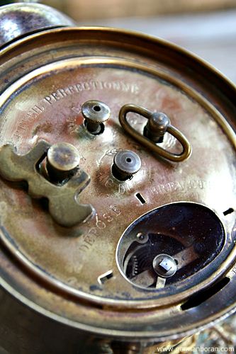 รหัส: C9_38 ข้อมูล: นาฬิกาปลุกไขลานโบราณจากแดนน้ำหอม ยุค 1900 ยี่ห้อ Japy Freres ณ Beaucourt หน้าปัดขนาด 10x10cm. ตัวเรือนงามๆ ตีกระดิ่งบน ตกแต่งหลุยส์ๆ ฝาหลังเป็นภาษาฝรั่งเศส มีช่องมองเครื่องกลไกจักรกรอกทำงานแสนคลาสสิค เรือนนี้หายาก น่าสะสมเป็นที่สุดจ้า ^_^