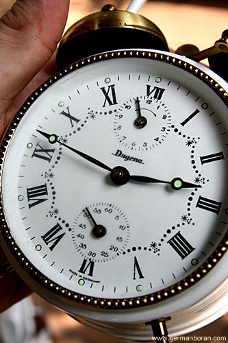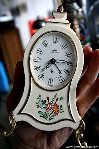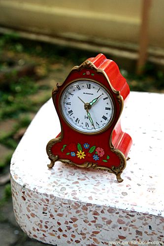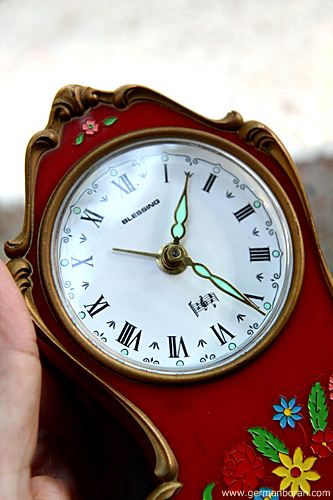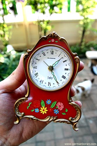 รหัส: C9_81 ข้อมูล: นาฬิกาปลุกไขลานเยอรมันโบราณ ยี่ห้อ Blessing ขนาด 8x11cm. ปลุกเสียงกล่องดนตรีสวิส ตัวเรือนเพ้นส์ลายดอกไม้งามๆ หน้าปัดจ๋วยๆ น่าสะสมค้าบบบ  ;D