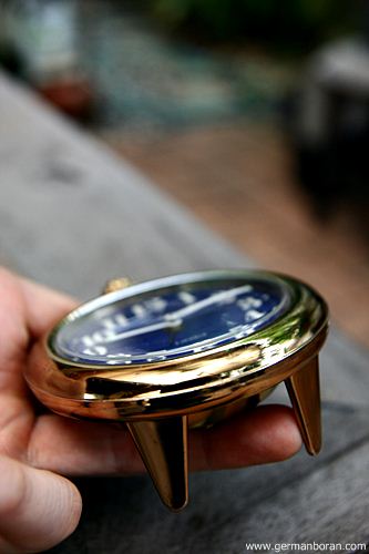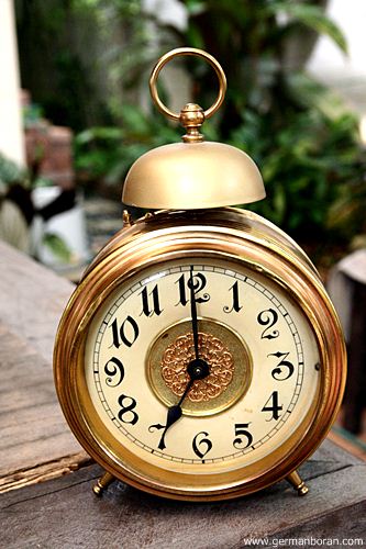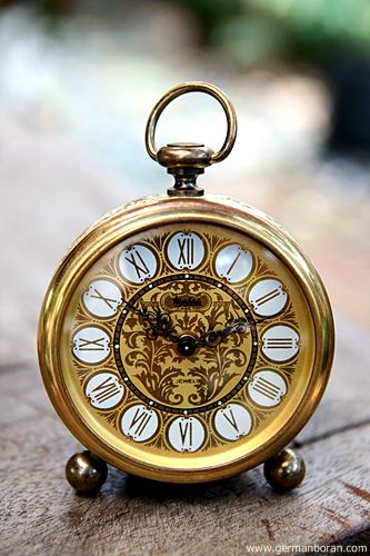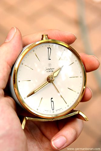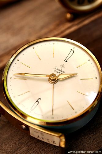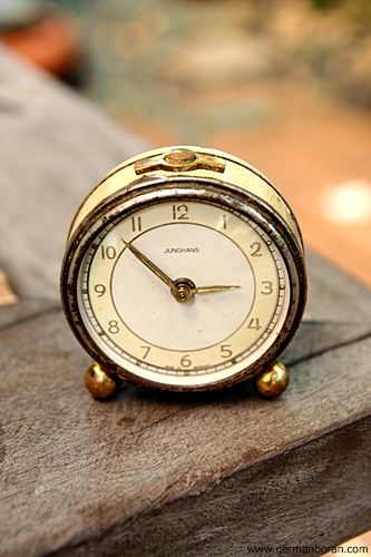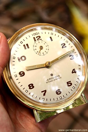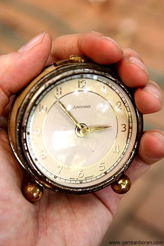 รหัส: B5_13_7 ข้อมูล: นาฬิกาปลุกไขลานเยอรมันโบราณ(Antique Alarm Clock) ยี่ห้อ Junghans รุ่น BIVOX ไซส์จิ๋วหลิว ขนาดหน้าปัด 6x6cm. ตัวเรือนดีไซน์น่ารัก ทองเหลืองเงาๆ สวยๆ  ;D