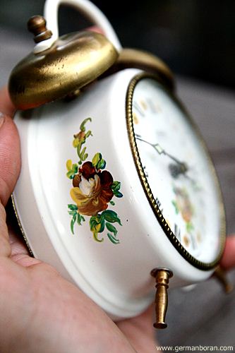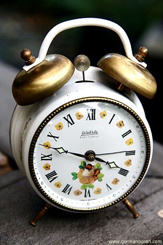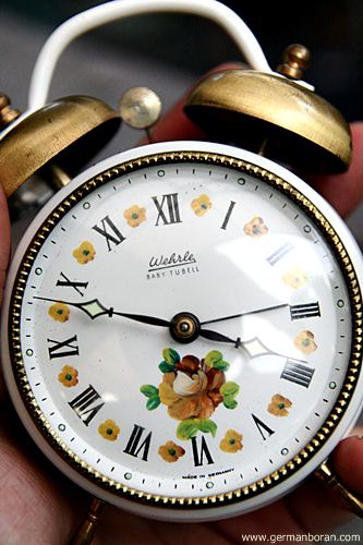 รหัส: A6_99 ข้อมูล: นาฬิกาปลุกไขลานเยอรมันโบราณ ยี่ห้อ WEHRLE ไซส์เล็ก ตีสองกระดิ่งบน ขนาดหน้าปัด 6x6cm. ลายดอกไม้ หายากน่าร้ากกก  :-*