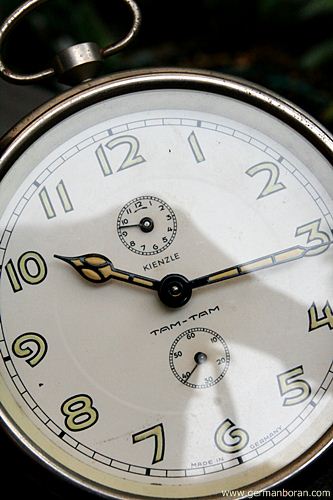 รหัส: B3_37 ข้อมูล: นาฬิกาปลุกไขลานเยอรมันโบราณ ยี่ห้อ Kienzle รุ่น TAM-TAM ขนาด 6x6cm. ผลิตช่วงปี 1920-30 หน้าพิมพ์ชื่อห้างร้าน สวยคลาสสิคมากๆ เอาเก็บเข้าตู้สะสมได้เลยครับ ;D