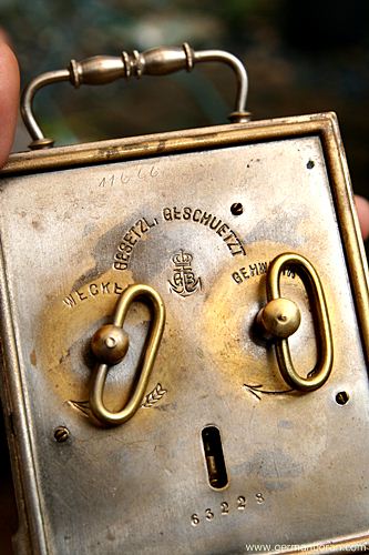 รหัส: B9_40 ข้อมูล: นาฬิกาปลุกไขลานเยอรมันโบราณ ยี่ห้อ Gustav Becker(GB) ยุคต้น 1900 ขนาด 8x10cm. ระบบตุ้มแกว่ง ปรับเข็มปลุกด้านหน้า โบราณ แปลก หายาก น่าสะสมจ้าาา  ;D