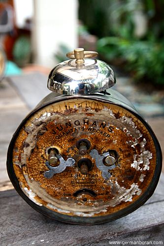 รหัส: B6_32_3 ข้อมูล: นาฬิกาปลุกไขลานเยอรมันโบราณ(German Alarm Clock) ยี่ห้อ Junghans ยุค 1900 หน้าปัดขนาด 10x10cm. ใช้งานได้ครบทุกฟังก์ชัน หลังฟิล์ม(เก่าแท้แน่นอน ^_^) พิมพ์ชื่อห้างร้าน J.H. Then Uhren u. Optik ณ เมือง Schweinfurt เยอรมนี เป็นภาษาเยอรมัน น่าสะสมครับ  :-*