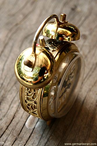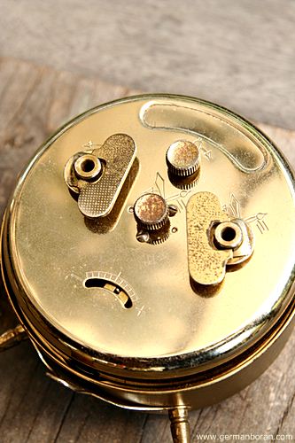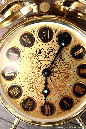 รหัส: C2_27 ข้อมูล: นาฬิกาปลุกไขลานเยอรมันโบราณ(German Alarm Clock) แบบไขลาน ยี่ห้อ Meister-Anker ขนาด 10x10cm. หน้าปัดสีทองเล่นลายไร้รื้วรอย ลวดลาย 12 จักรราศี ตีกระดิ่งบนสองข้าง สวยๆ ครับ  ;D