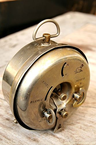 รหัส: C2_42 ข้อมูล: นาฬิกาปลุกไขลานเยอรมันโบราณ ยี่ห้อ ศรไขว้(HAU) รุ่น PILOT หน้าปัดขนาด 10x10cm. หน้าพิมพ์ชื่อห้างร้าน เลขตลก รุ่นช่วงต้นศตวรรษ 1900 สองกระดิ่ง สวยสุดๆ จ้าาา  ;D