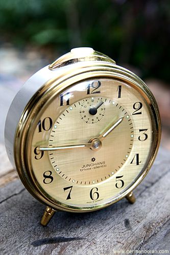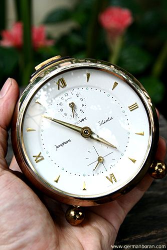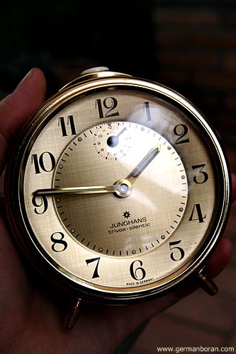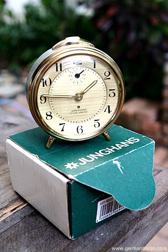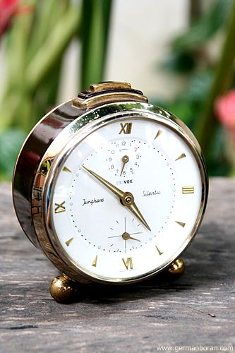 รหัส: C5_5 ข้อมูล: นาฬิกาปลุกไขลานเยอรมันโบราณ ยี่ห้อ Junghans รุ่น Trivox Silent-Tic ขนาด 9x9cm. ปลุกเป็นเสต็ป(Trivox) แถมเดินเงียบ(Silent-Tic) หน้าปัดสวยๆ ทองๆ สภาพกริ๊บๆ พร้อมกล่องแต๊ๆ สมควรเก็บเป็นอย่างยิ่งครับ อิอิ ;D